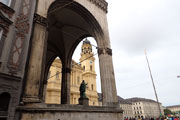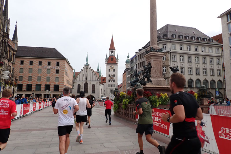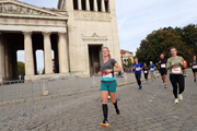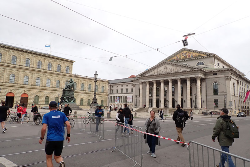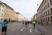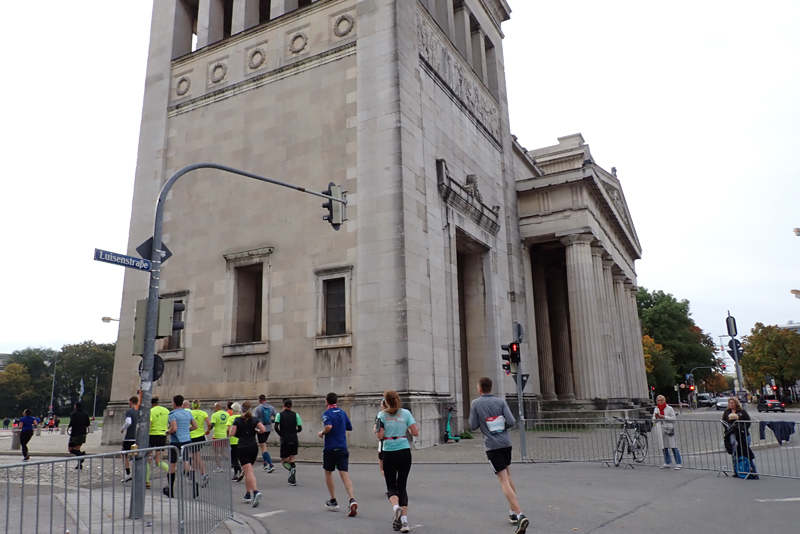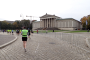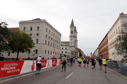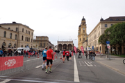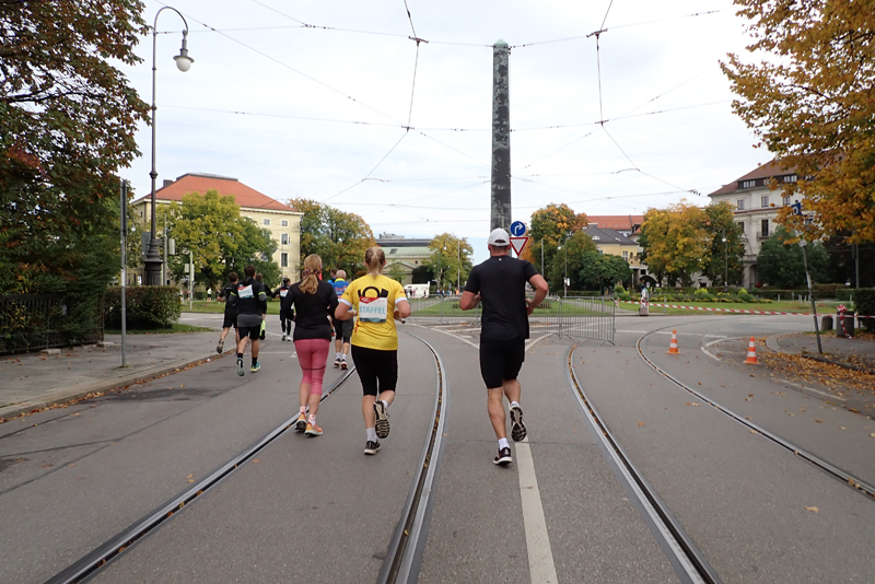 Die Schleife durch die Maxvorstadt, die unter anderem am Obelisken am Karolinenplatz vorbeiführt, wurde nun an den Anfang des Marathons gelegt. Jürgen und ich sind uns einig. Diese Änderung nehmen wir gerne an, da die Schleife am Ende doch meistens äußerst zäh war. So sind wir noch frisch und freuen uns trotzdem als wir zurück auf der Leopoldstraße sind. Nun geht es noch kurz runter zum Odeonsplatz, der mich immer wieder aufs Neue begeistert. Die Feldherrenhalle mit der Residenz, die Theatinerkirche, sowie das Bazargebäude bilden einfach ein super Ensemble. Wir wenden und dürfen dieses schöne Stück München somit sogar zweimal genießen. Es geht wieder die Leopoldstraße rauf, vorbei am Siegestor und uns kommen nun die Läufer entgegen, die noch hinter uns liegen.