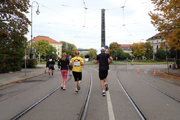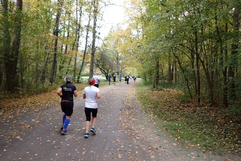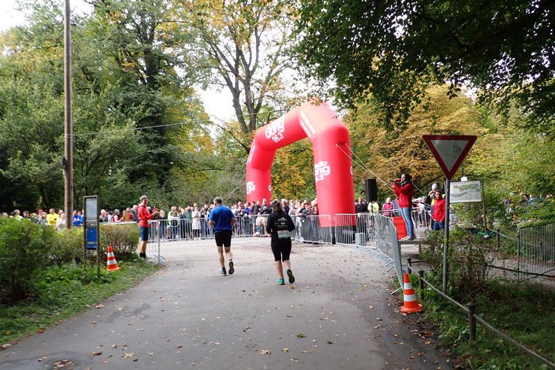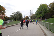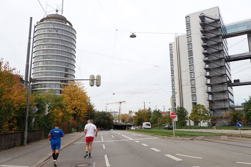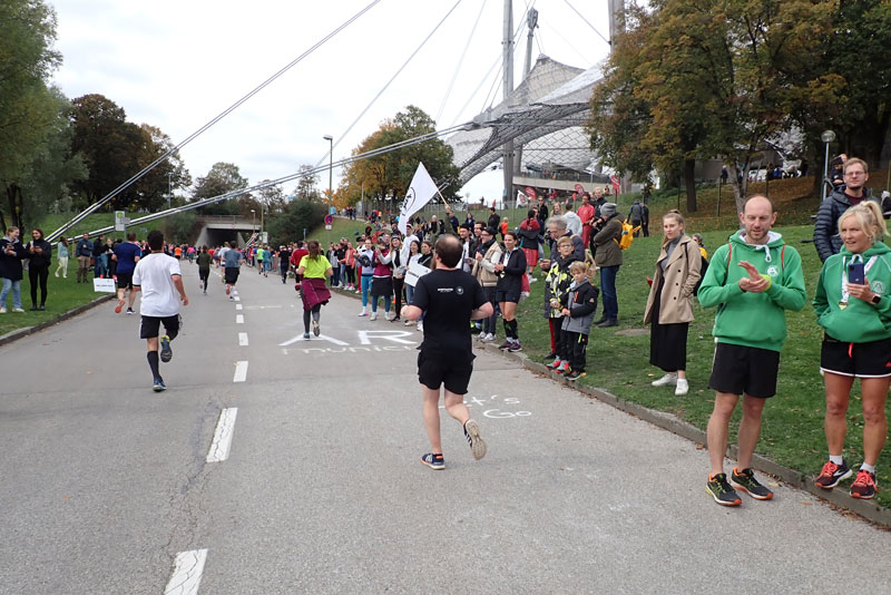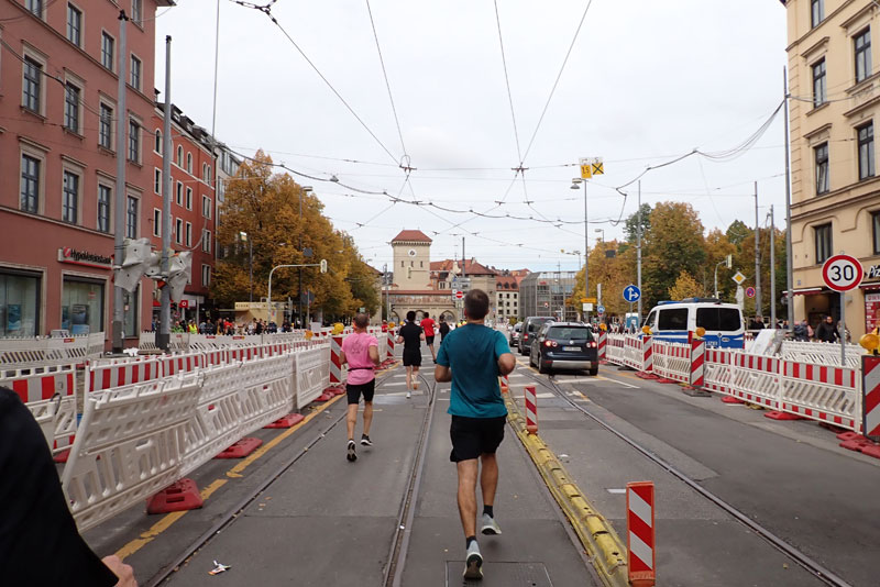 Nur fünf Minuten nach der Elite sind wir dran. Nach einem gefühlten Sprint über 150 Meter verlassen wir das Stadion durch das Marathontor und können leicht herausnehmen. Etwas über einen Kilometer laufen wir auf dem Spiridon-Louis-Ring durch den Olympiapark bis zur Ackermannstraße. Wir ziehen bis dahin noch so gut wie möglich mit und werden nach und nach ans Ende des Feldes der sub4-Läufer durchgereicht. Auf der Ackermannstraße sind wir dann schon fast alleine und warten bis uns das sub4:30-er Feld einholt. Schnell haben Jürgen und ich unser Wohlfühltempo erreicht, was zu Jürgens Überraschung deutlich schneller ist als sein momentanes Trainingstempo. Wir machen uns darüber keinen Kopf und traben nebeneinanderher.