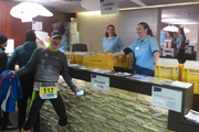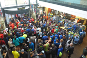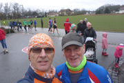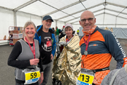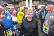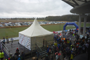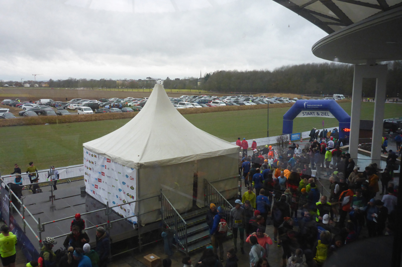 Mit Charly besuche ich noch schnell das Verpflegungszelt hinter dem Zielbogen. Hier kann man sich bereits am vollen Verpflegungsangebot mit Getränken, Obst oder auch am großen Kuchenbuffet bedienen. Wer partout die Therme nicht betreten will, oder es vielleicht nach dem Zieleinlauf ziemlich eilig hat, könnte hier auch seine Ersatzkleidung deponieren. Das scheinen aber doch sehr wenige im Sinn zu haben.