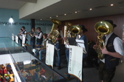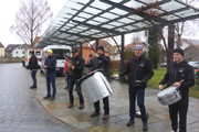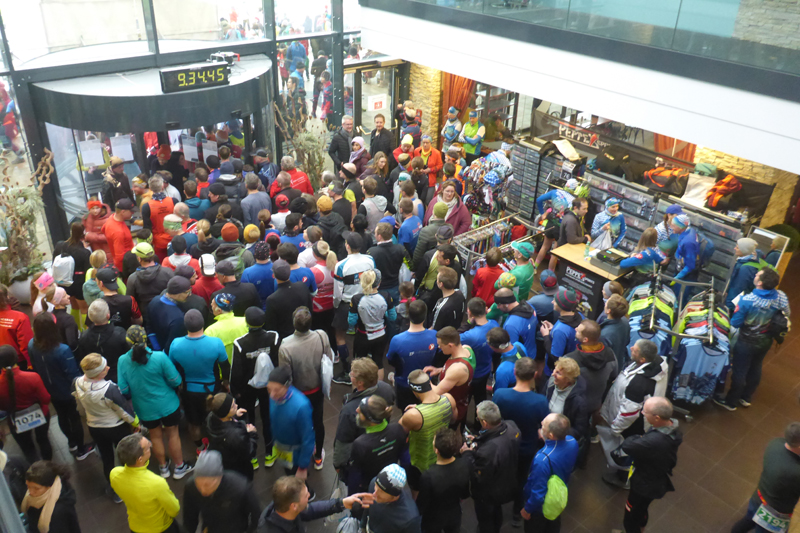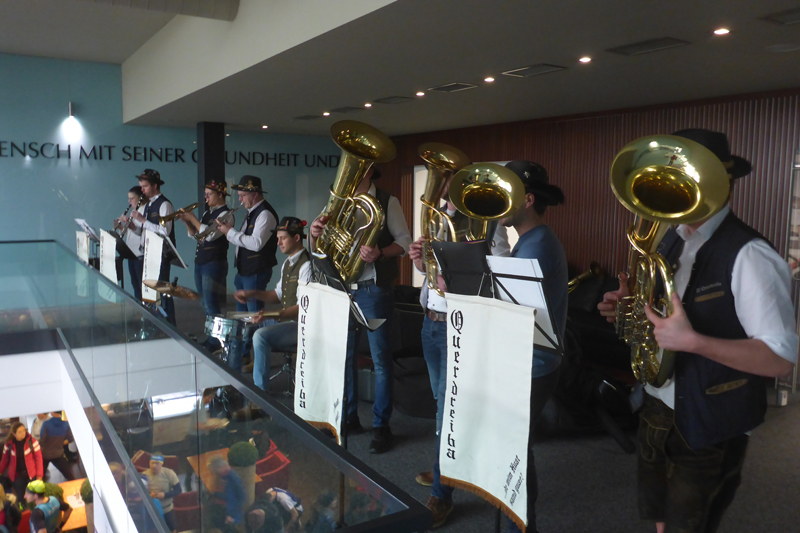 Für Nachmelder ist die Ausgabe der Startnummern im Atrium der Johannesbad-Therme bereits um 7 Uhr morgens möglich. Einheimische machen davon gerne Gebrauch, aber heuer siehts da etwas mau aus, so viele scheinen sich das nicht mehr zu überlegen, obwohl hier keine zusätzliche Nachmeldegebühr erhoben wird. Der Wetterumschwung wird hier seinen Teil dazu beigetragen haben. Die Organisationsgebühr ist im Übrigen immer gleich, es gibt auch für Spätentschlossene keine höheren Gebühren. Beim Marathon und Halbmarathon beträgt sie € 49. Mit zwei Eintritten in die Therme und dem Pasta-Essen haben wir die Gebühr schon längst wieder herinnen. Auf der Empore über dem Nachmeldeschalter sorgt die bayerische Blaskapelle Querdreiba für volkstümliche Unterhaltung.