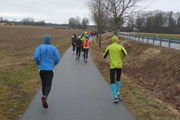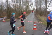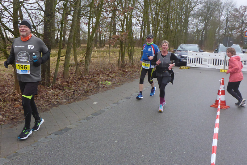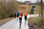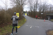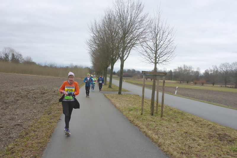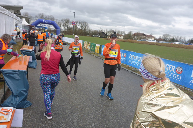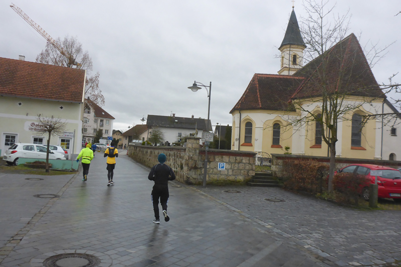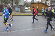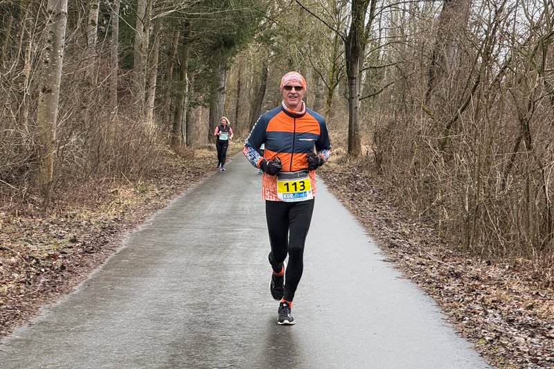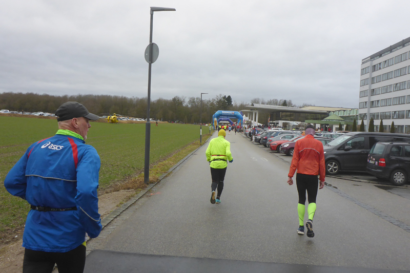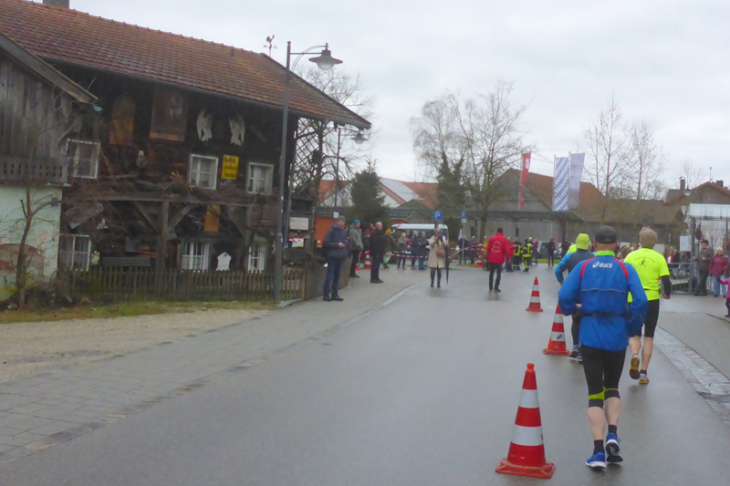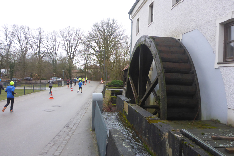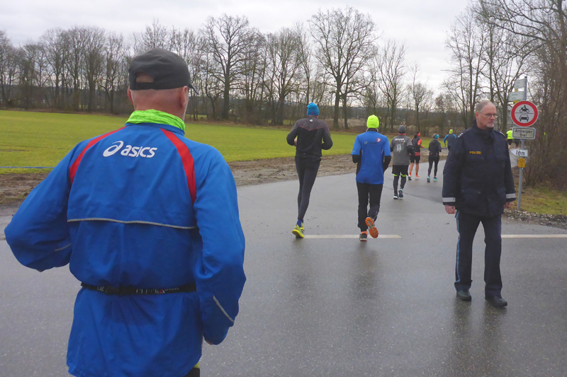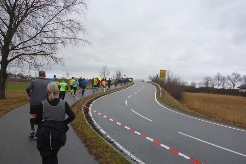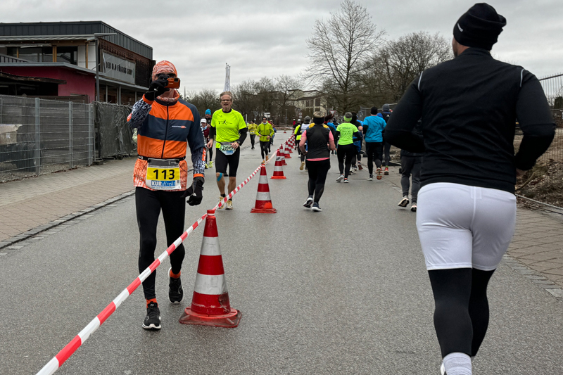 Am Ortsrand entlang wartet bald eine weitere Straßenüberführung auf uns über die Obere Inntal Straße, die ist schon etwas länger, die dreihundert Meter auf und ab aber natürlich kein Problem, so steil geht’s da nicht rauf. Das war‘s dann im Prinzip auch schon mit den Höhenmetern, das gleiche gilt es dann für die Marathonis nur nochmal in der dritten Runde zu meistern. Wesentlich unangenehmer ist jetzt der kühle und etwas böige Wind, der uns ohne jeglichen Schutz entgegenbläst.