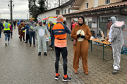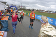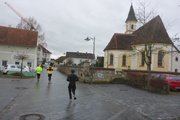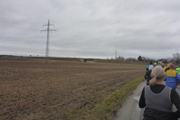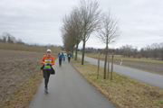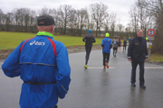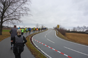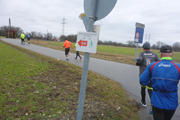 In weiten Abstand zum Ortsrand ziehen wir in einem langgezogenen Bogen um Bad Füssing, die vier Kilometer fühlen sich aber eher wie eine lange Gerade an. Außer einigen Straßeneinmündungen ist hier wenig Abwechslung geboten. Nach 4,5 km wartet die erste Versorgungsstation auf uns. Man ist auch auf kühleres Wetter eingestellt, so ist der warme Tee für mich die bevorzugte Wahl. Aber natürlich gibt es auch Wasser, Iso und Cola in kalter Form. |