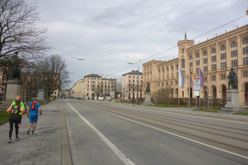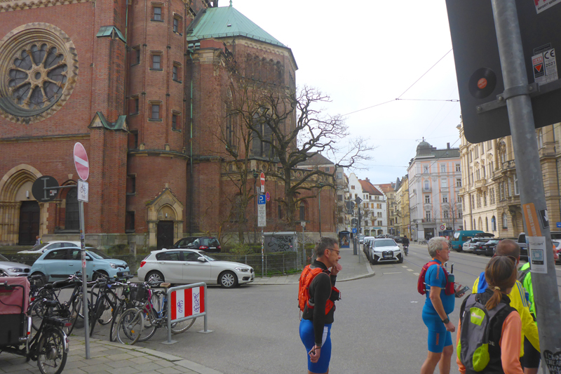 Zum festgelegten Startplatz müssen wir erst noch über den Kabelsteg und die Mariannenbrücke die Isar überqueren. In der Thierschstraße, neben der Kirche St. Lukas, wird gestartet. Der Grund für die Verlegung ist, dass der Track ab Muffathalle fast 44 km aufweist, so kommen wir näher an die Marathon-Distanz. Auf meinem GPX sind es jetzt noch genau 42,9 km. Um Punkt 10 Uhr schlagen die Glocken von St. Lukas, für uns das Signal zu starten.