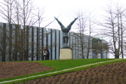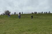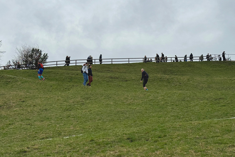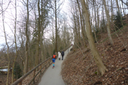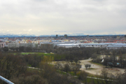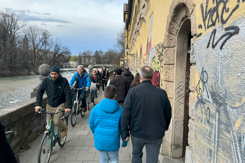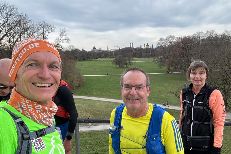 Nach gut 10 km ist es soweit, wir sind in Schwabing und unser erster wirklicher Anstieg im Luitpoldpark steht an. Die Entstehung des Parks geht auf ein Geschenk an den bayerischen Prinzregenten Luitpold zurück. Im Jahre 1911, zu seinem 90. Geburtstag pflanzte man ihm zu Ehren passend dazu 90 Linden. Um diesen Hain legte man einen öffentlichen Park an. Nach dem Zweiten Weltkrieg häufte man im Nordteil des Parks einen 37 Meter hohen Schuttberg aus den zerbombten Überresten der Stadt auf. Der Uphill auf den Luitpolthügel lohnt sich, in Serpentinen geht es hoch. Großartig ist heute die Aussicht bei Fönlage über die Dächer von München bis hin zu den schneebedeckten Alpengipfeln. Ein Bronzekreuz auf dem Gipfel erinnert an die Opfer der Bombenangriffe. Auf dem Nordhang geht es wieder runter. Andreas erzählt uns, dass hier im Winter eine Rodelpiste ist und dazu eine der steilsten in München und daher sehr beliebt.