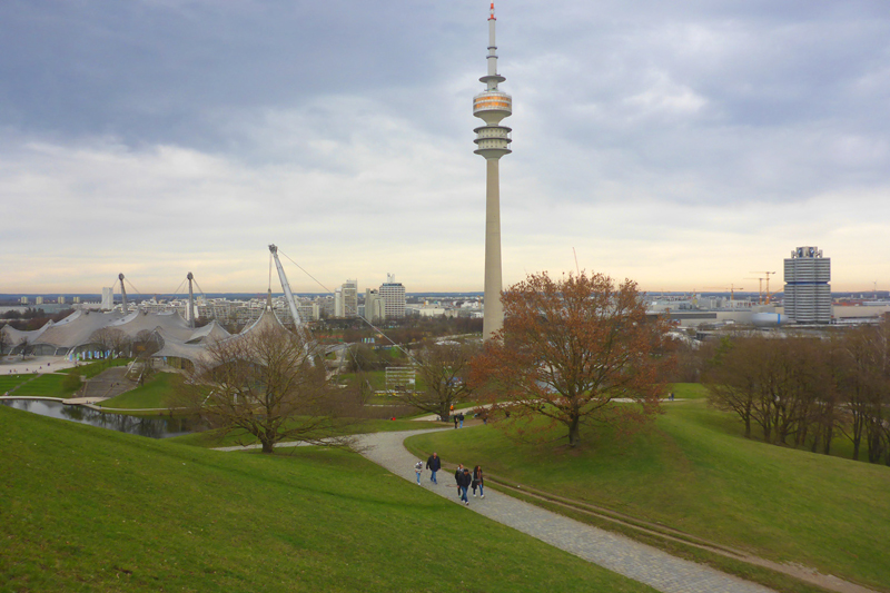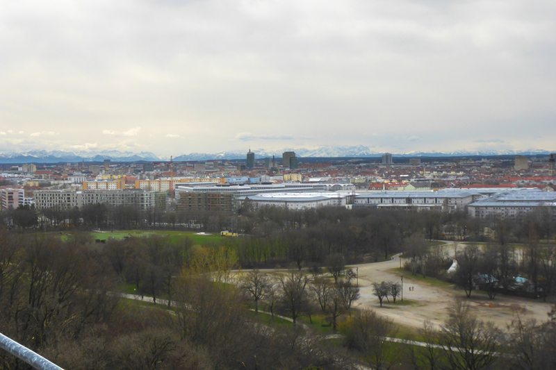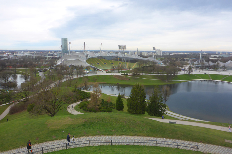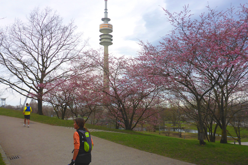 Im Olympiapark ist für uns Hanami angesagt, das japanische Wort bedeutet „Blüten betrachten“. Die Olympia-Kirschbäume stehen gerade in voller Blüte. Die Bäume kamen tatsächlich aus Japan nach Bayern, die Stadt Sapporo schenkte sie den Münchnern, weil die beiden Städte 1972 die Olympischen Spiele ausrichteten, die Japaner jene im Winter, die Bayern die im Sommer. Über einen Kilometer zieht sich der Martin-Luther-King-Weg auf den höchsten Punkt des Olympiabergs, der auch eine der höchsten Erhebungen Münchens darstellt. Dadurch, natürlich mit grandioser Rundumsicht. Mehr noch als die Alpen, fasziniert mich hier die wunderbare Aussicht auf den Olympiapark.