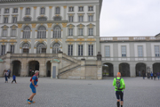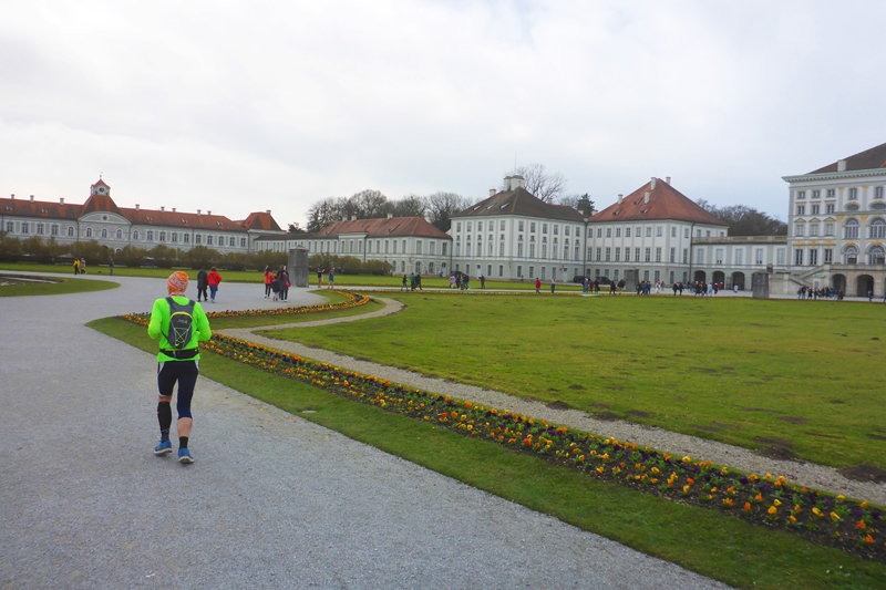 Knapp 4 km sind es bis Schloss Nymphenburg. Ich lauf mitten im Wasser des Nymphenburger Kanals, zumindest zeigt mir das der Track auf meiner Uhr so an. Da hat der Satellit wohl eine kleine Abweichung. Udo hat sich an der Nördlichen Auffahrtsallee eine Flasche Wasser deponiert und nimmt diese an sich. Andreas, Judith und Jürgen versorgen sich wenig später im WC im Eingangsgebäude des Schlosses. Ich brauche nix, mir reichen 3 gefüllte Flaschen im Rucksack, das sind knapp 2 Liter, da komme ich locker durch.