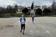 Durch den Hofgarten gelangen wir nach 3 km zum Eingang in den Englischen Garten und wenig später sind wir schon am Monopterus. Unser erster kurzer Aufstieg steht an. Der Ziertempel im griechischen Stil liegt auf einem künstlichen 16 Meter hohen Hügel und ist ein toller Aussichtspunkt. Die Idee hatte eine große Gruppe Läufer und Läuferinnen schon vor uns, aber sie kommen uns gerade von oben entgegen und machen den Platz frei. Der Blick über die Wiesen des südlichen Englischen Gartens bis zu den Türmen der Münchner Innenstadt ist umwerfend.