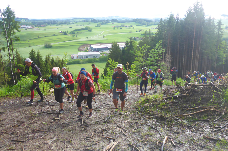 Auf der Rückseite passieren wir wieder die Kappeler Alp, gleich wird es wieder lebhaft auf der Strecke. Die später gestarteten S-Starter*innen kommen uns von oben entgegen. Kurz vor dem Sportheim Böck endet der „V500“ wieder mit einer Zeitmessmatte. Gesamt 15 km und bereits 1400 absolvierte Höhenmeter stehen hier für die XL-er auf der Uhr. |