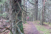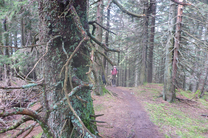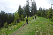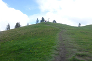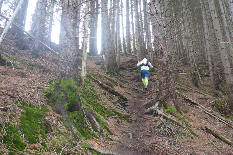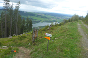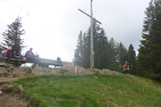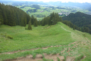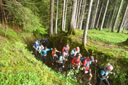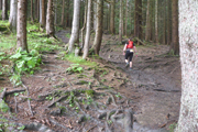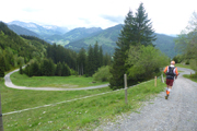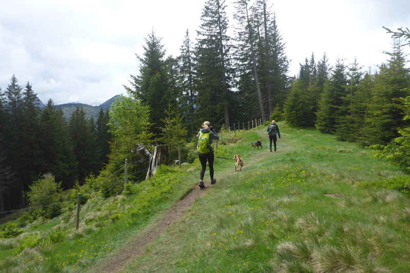 Für uns geht es ebenfalls abwärts, in Serpentinen führt uns die Schotterstraße bis kurz vor die Wallfahrtskirche Maria Trost. Ein schöner wurzeliger und wieder oft mit vielen Holzstufen abgestützter Pfad führt uns im Wald wieder aufwärts bis zur Kappeler Alp, wo nach 8,5 km die erste Verpflegungsstation auf uns wartet.