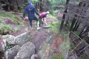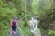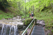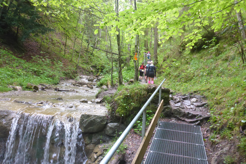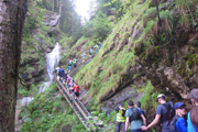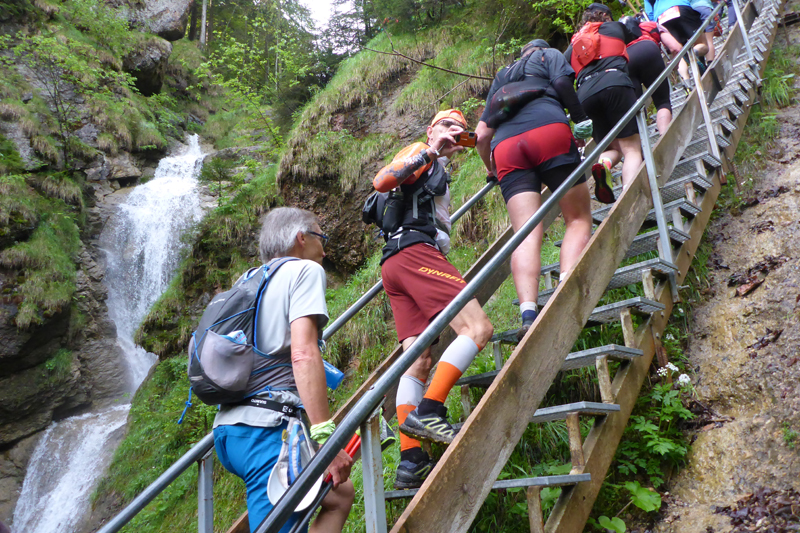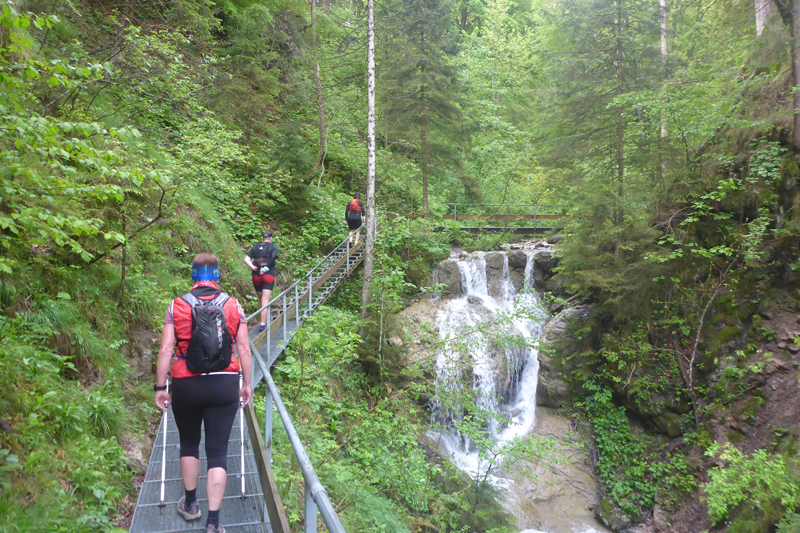 Nach gut 2 km erreichen wir mit dem Wasserfallweg bereits den optischen Höhepunkt und so etwas wie das Aushängeschild der Veranstaltung. Genau 599 Stufen weißt der Wasserfallweg auf. Bis vor einigen Jahren war er noch komplett mit Holz abgestützt. Nachdem er 2016 durch einen Felssturz arg in Mitleidenschaft gezogenen wurde, wurden viele Holzteile durch Stahl und Gitterroste ersetzt. Genau 237 Stufen bestehen jetzt aus Stahl. Der Einstieg führt uns gleich auf die längste Stahlgittertreppe neben dem höchsten Wasserfall des Schloßbächel. Er rauscht hier über zahlreiche Wasserfälle von der Alpspitz runter ins Tal.