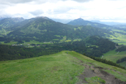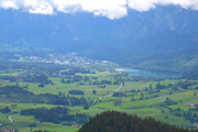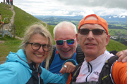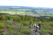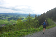 Kontinuierlich steil zieht sich der Wasserfallweg über die vielen Stege, Holzstufen und Brücken nach oben. Um genügend Fotos schießen zu können, verzichte ich hier noch auf meine Stöcke. Der letzte Abschnitt führt uns aus dem hohen Baumbestand auf eine Lichtung. Ich bin beeindruckt. Noch nie hatten wir so eine wunderbare glasklare Aussicht über die Voralpenlandschaft.