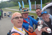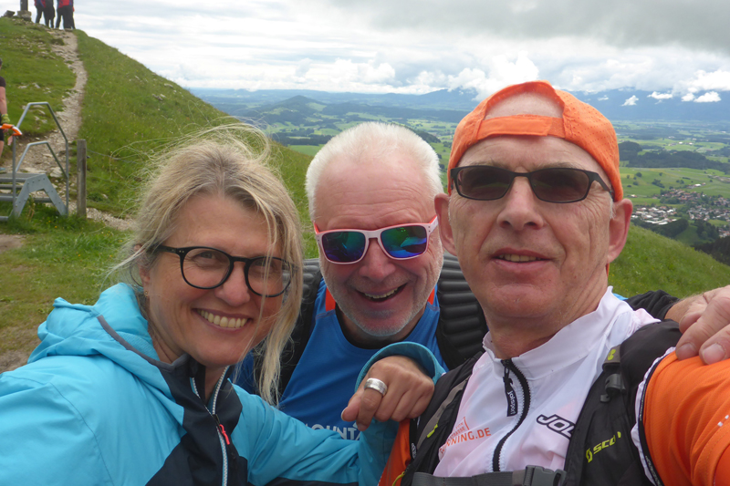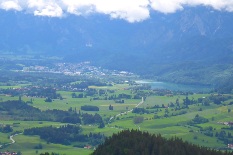 Rudi und Jutta sind vom Startplatz umgezogen und erwarten hier die XL-er. Jutta weißt mich sofort auf die grandiose Aussicht heute hin. Erstmalig präsentiert sich uns der berühmte Neuschwanstein-Blick im glasklaren Tageslicht. Über dem Weissensee und den Dächern von Füssen thront das Schloss gut sichtbar, ohne es groß suchen zu müssen. Vor lauter Euphorie über die grandiose Aussicht, vergesse ich glatt etwas zu trinken, so muss ich nochmal zurück an den Getränkestand.