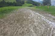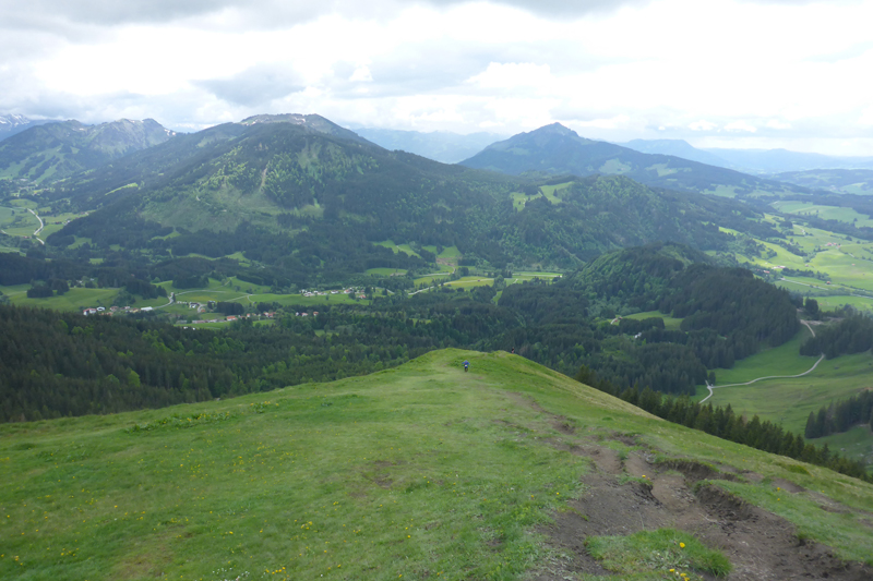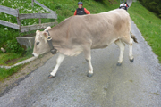 Ich lasse es lieber etwas gemächlicher angehen, wir sind ja erst im Anfangsstadium unseres Rennens und will hier nicht bereits meine Körner verschwenden. Eine Kuh steht mitten auf der Piste, als eine Radlerin von oben ankommt, setzt sie sich urplötzlich fluchtartig in Bewegung und zwingt die Bikerin zu einer Notbremsung, um nicht auf die Hörner genommen zu werden.