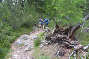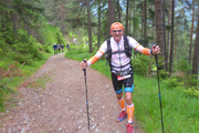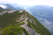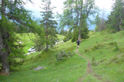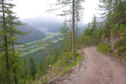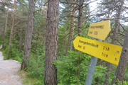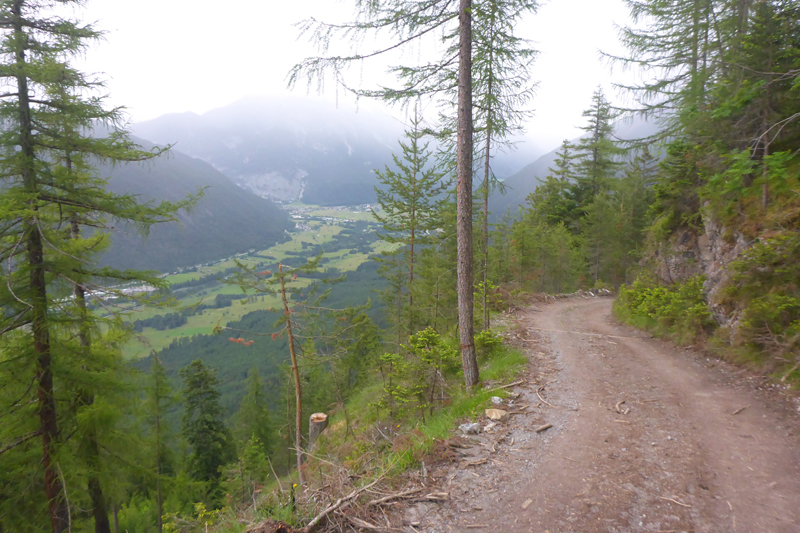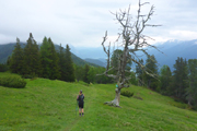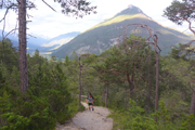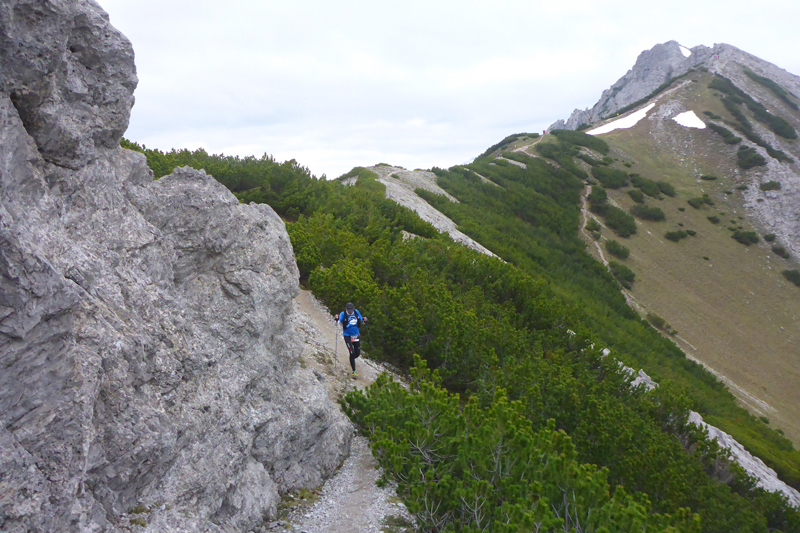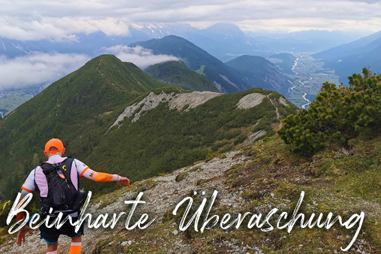 Nach dem Haiminger Kreuz und diesem kleinen Zwischenaufstieg durch felsiges Terrain geht es nun langsam abwärts und wir schlängeln uns durch Wälder von Latschenkiefern. Die sind meist nicht allzu hoch, so können wir auch immer wieder das Panorama nach unten einsehen. Nach etwa 3 km auf dem Grat erreichen wir die Baumgrenze, welche uns dann doch die Sicht nach unten stark einschränkt. Entschädigt werden wir dafür aber mit einem traumhaften Single-Trail durch lichten Bergwald über einen wunderbar zu laufenden weichen Wiesenboden. Nach 16,8 km erreichen wir auf 1.800 m Höhe unsere nächste Labe unweit der Haiminger Alm. |