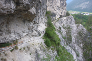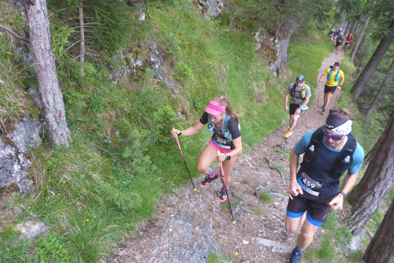 Es wird spürbar steiler und nach Durchquerung einer sattgrünen Almwiese auch deutlich rustikaler. Nach gut 11 km erreichen wir die Streckentrennung. Ein Ordner passt gut darauf auf, dass die T52- und die T26-Läufer*innen ihrer Route nach rechts folgen. Auf dem technisch anspruchsvolleren Abschnitt, wird auf einem seilversicherten, leichten Klettersteig auch Trittsicherheit und Schwindelfreiheit verlangt.