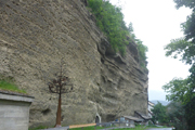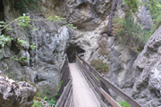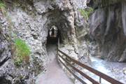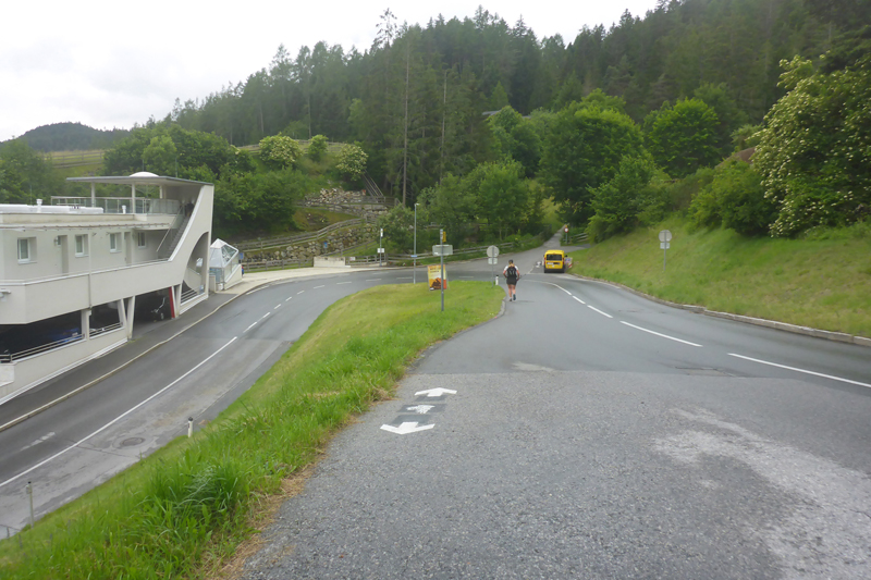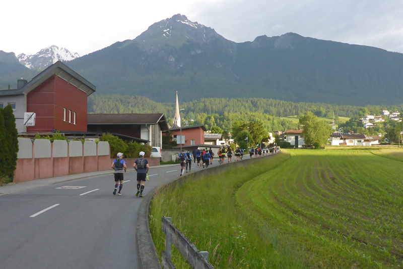 Nach drei Kilometern erreichen wir den Wald und wenig später auch die erste wirkliche, aber noch nicht ernsthafte Steigung. In einem Bogen laufen wir am Südwesthang des Tschirgant entlang bis nach Karrösten. Genau unter uns verläuft hier der 5 km lange Roppener Tunnel der Inntalautobahn. Etwa einen Kilometer nach dem Ortsdurchlauf erreichen wir nach ca. 7 km unsere erste Labestation. Ganz ungewohnt wird bereits so früh Cola angeboten. Zusammen mit einem Stück Kuchen nehme ich das Angebot zu einem ersten Frühstück für mich gerne an. Während der Pause flitzt bereits der Führende des eine halbe Stunde nach uns gestarteten TS26 vorbei. Pause braucht er natürlich nicht.