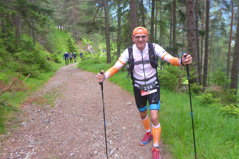 Fast vom Start weg bin ich mit Karl-Walter unterwegs, ihn kennt von Veranstalterseite so ziemlich jeder Ordner, auch hier wird er wieder angesprochen. Bei jedem seiner Starts wurde er bisher als ältester Teilnehmer prämiert. Seinen Bekanntheitsstatus hat er aber bei seinem ersten Auftritt hier erlangt, als er sich oben auf dem Grat schwer verletzte und mit dem Heli ausgeflogen werden musste und darauf wird er auch immer wieder angesprochen. Das ist kein billiges Vergnügen, das man ohne eine dementsprechende Versicherung (wird hier auch vom Veranstalter angeboten) nicht ersetzt bekommt.