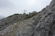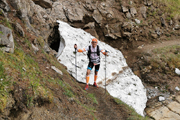 Nach der Trennung wird es für Karl-Walter und mich schlagartig ruhig, wir sind noch die restlichen in Sichtweite verbliebenen Marathonis, aber ich kann mich erinnern, es müssten schon noch ein paar hinter uns liegen. Hier auf etwa 2.000 m Höhe liegen sogar noch ein paar Restschneefelder, die es zu übersteigen gilt, dazu einige knifflige Geröllabschnitte. Der Schlussabschnitt führt uns auf einem Steig diagonal an der Bergflanke entlang durch Latschen auf den Grat. Das Gipfelkreuz des Tschirgant, sowie die geröllige und felsige Flanke des Tschirgant Gipfels liegen hier direkt vor uns. Ich versuche angestrengt, in der Felswüste noch Starter des TS26 auszumachen, kann aber niemand entdecken.