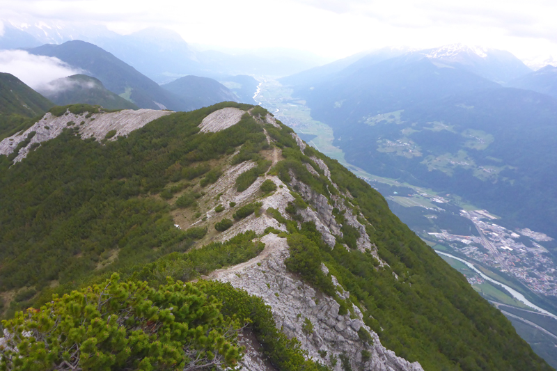 Bevor es weiter geht, muss ich natürlich erst einmal diese unglaubliche Aussicht genießen. Links in Laufrichtung liegt das Gurgltal, rechts das Oberinntal und das vordere Ötztal. Ganz im Süden zeigt sich die Silhouette des Alpenhautkammes mit teils noch weißen Spitzen. Es hat sich leider weiter zugezogen, aber noch ist es trocken und wir haben größtenteils freie Sicht, nur vereinzelte Wolken beeinträchtigen die Sicht nach unten.