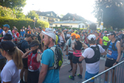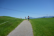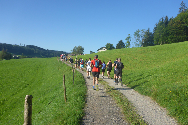 Für die Teilnehmer beim Marathon beginnt ab hier praktisch auch der zweite Teil unseres Parcours. Nachdem der erste Abschnitt die meisten Aufstiegsmeter und auch viele Wechsel auf unterschiedlichem Terrain, davon auch diverse Trails beinhaltete, ist die zweite Hälfte doch deutlich einfacher und führt fast überwiegend nur noch über Asphalt und Schotterwege. Wegen dieser unterschiedlichen Bodenbeläge taucht in den Sozialen Medien oft auch die Frage auf, kann der Marathon auch mit Straßenschuhen gelaufen werden? Ich würde sagen, bei einem Wetter wie heute und ohne größere Regenfälle im Vorfeld, in jedem Fall. Sobald aber Regen vorhergesagt ist, oder die Strecke eh schon durchgeweicht ist, sollte man unbedingt Trailschuhe mit ausreichend Profil wählen.