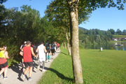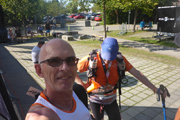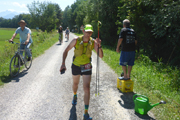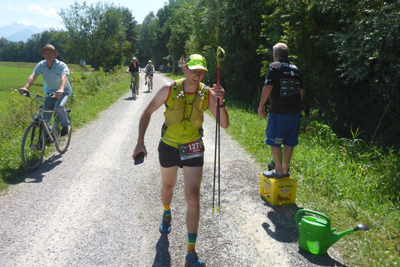 Nach knapp 38 km läutet die Labestelle an der Iller unseren Schlussabschnitt ein, bis ins Ziel geht es nur noch an der Iller entlang. Wasser ist hier bereits knapp und sollte etwas rationiert werden, da noch viele auf der Strecke sind, höre ich einen Helfer klagen. Mir ist gerade Cola eh lieber, hiervon gibt es scheinbar noch keinen Engpass. Dazu wird auch noch jede Menge an Obst, darunter auch saftige Wassermelonen angeboten.