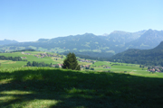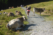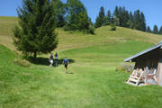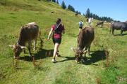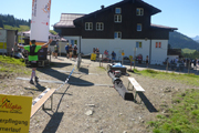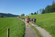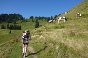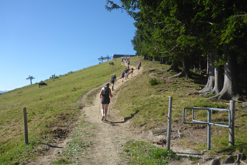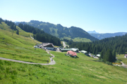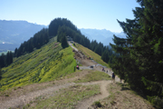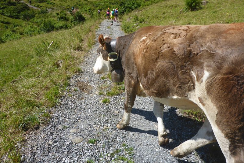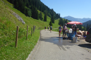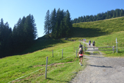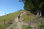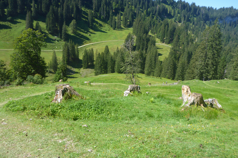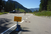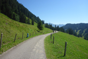 Mit über 1.100 Aufstiegsmetern liegen bereits der größte Teil hinter uns, ab Grasgehren geht es überwiegend abwärts. Nicht ungefährlich ist die Überquerung der Straße auf den Riedbergpass, daher auch gesichert durch einen Posten. Bei Bikern und Sportwagenfahrern ist die Passstraße wegen ihrer vielen Kurven sehr beliebt, wovon ich mir auf den nur wenigen Metern, schnell ein Bild machen kann. Ein grasgrüner Lambo und etliche hochmotorisierte Bikes frequentieren innerhalb einer Minute nach mir die Straße.
