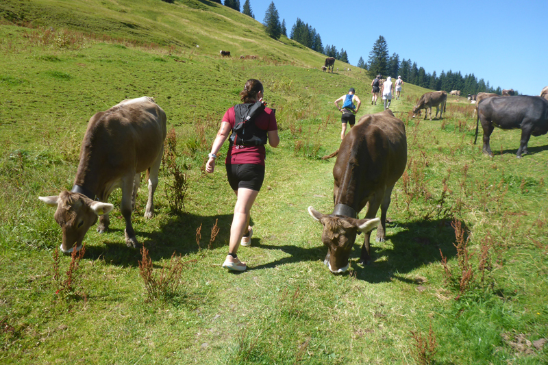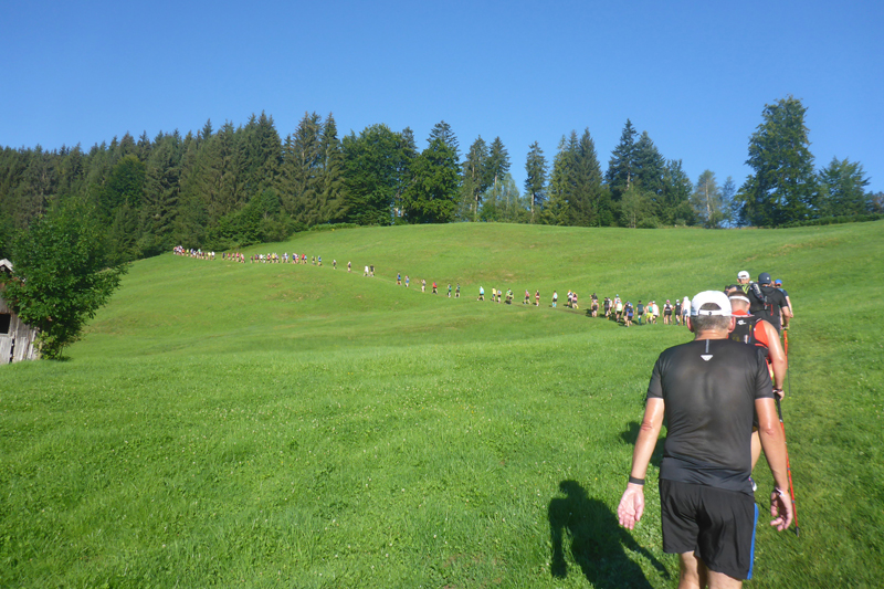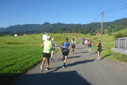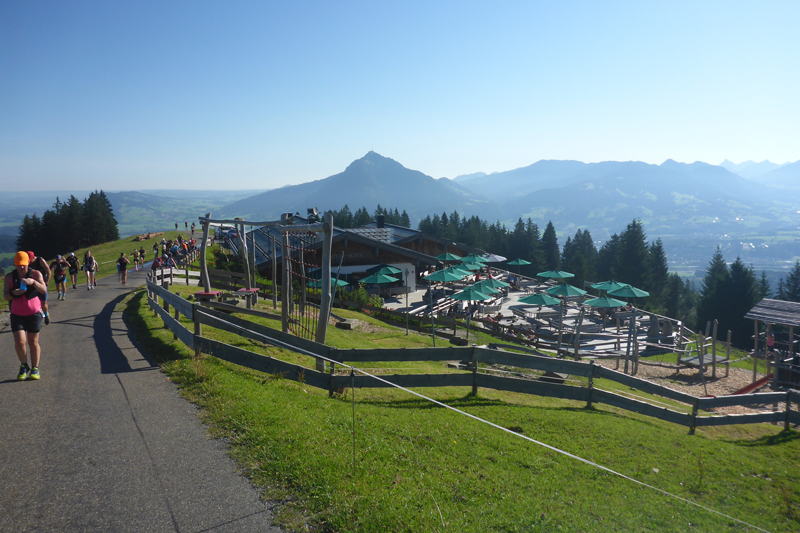 Über 7,5 km zieht sich die schmale Teerstraße durch das Lochbachtal, dabei verlieren wir 450 Höhenmeter. Aber bevor das Gefälle beginnt, zieht sich die Straße nach der Marathonweiche erst noch für 2 km ganz schwach nach oben. In meinem derzeitigen Zustand ist mir hier gerade nicht mehr nach Laufen zumute. Am Scheitelpunkt, bevor es dann endlich abwärts geht, können wir uns an der Freiburger Alpe wieder versorgen. Anschließend kann ich leicht bergab doch wieder Fahrt aufnehmen und bis zur nächsten VP bei km 29,6 am Ausgang des Lochbachtals im Laufschritt durchziehen.