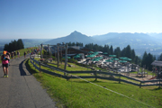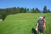 Auf einer Bank am oberen Waldrand des Herrenbergs gönne ich mir 30 Sekunden Pause und genieße kurz das traumhafte, sattgrüne Allgäuer Panorama. Meine Waden neigen zum Verkrampfen, ich muss mich zurückhalten. Hatte ich auch schon lange nimmer. Sachte abwärts geht es weiter bis zum Ortsanfang von Obermaiselstein, dort überqueren wir wieder die Passstraße.