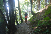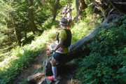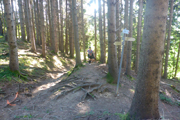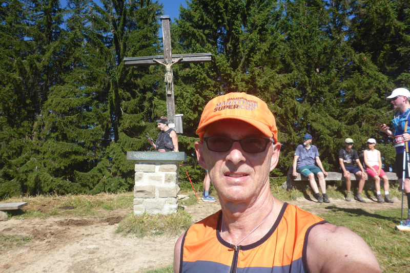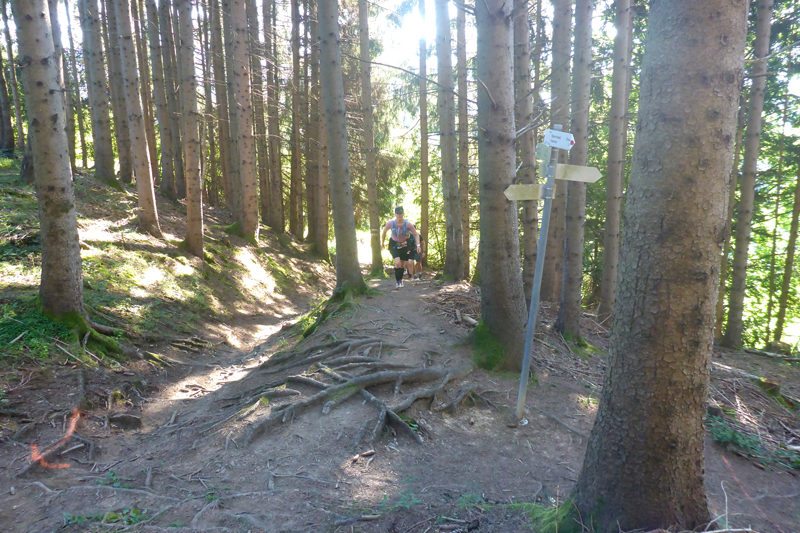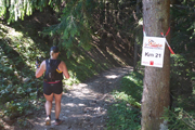 Anderthalb Kilometer später kommt die 21-km-Markierung, die Hälfte ist somit praktisch geschafft. Ich bin aber auch geschafft, die Luft ist raus und mein Akku ziemlich leer. Mein zu geringer Trainingszustand nach einer Laufpause rächt sich jetzt, so muss ich jetzt deutlich mehr Walking-Einheiten einlegen als mir lieb ist. Ich könnte es ja auch aufs hochsommerliche Wetter schieben, aber mich stört es nicht und möchte auch gar nicht darüber jammern. Ein schöner Trail führt uns weiter ins Lochbachtal. Nach etwa 22 km erreiche ich die Streckentrennung von Marathon und Ultra, für uns geht es nach links ins Tal, während die Strecke des Ultra Trail nach rechts, Richtung Hörnlepass führt.