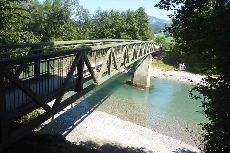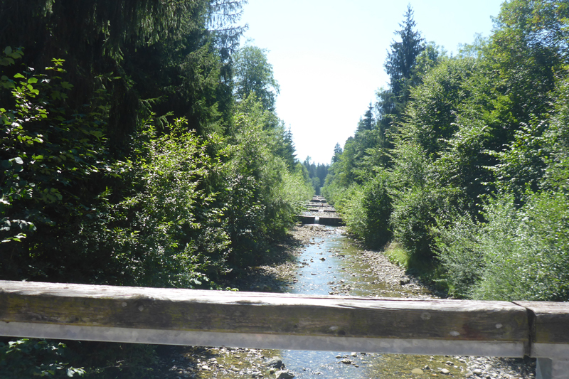Bis zur Iller folgen wir über 4,5 km der Weiler Ach. Der Gebirgsbach führt nur sehr wenig Wasser, aber es gibt einige schöne idyllische Stellen, wo sich auch größere Menge Wasser sammeln und hier können wir auch Personen beim Badevergnügen beobachten. Da könnte man schon auf dumme Gedanken kommen. Zwischendrin lindert eine Getränkestation meine Lust auf Nass.