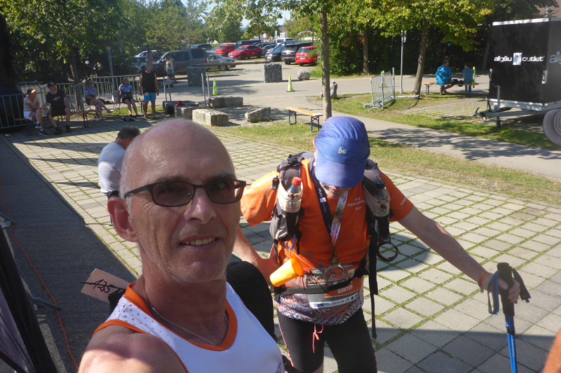 Nach 39,5 km wechseln wir über eine Brücke auf die andere Seite der Iller über. Kurz darauf folgt noch eine weitere Getränkestation. Auf einem Bierträger stehend bietet uns ein Helfer eine erfrischende Dusche mit einer Gießkanne an. Dem Angebot kann ich nicht Wiederstehen. Einfach herrlich. Erstmals seit langer Zeit, habe ich keine eigenen Getränke mitgeführt und ich habe sie auch nicht vermisst. Neun Versorgungsstationen waren für mich auch bei 30 Grad + vollkommen ausreichend.