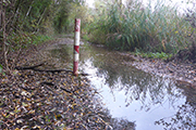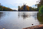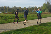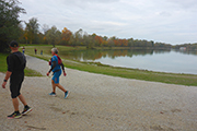Nach der halben Kuhsee-Umrundung führt uns die Dammstraße an den Auensee. Hier wäre jetzt eine Umrundung eingeplant, aber schon der Anlauf zum nördlichen Trail steht tief unter Wasser. Wir laufen am Damm weiter und beschließen, die fehlenden Meter am Weitmannsee anzuhängen. Mich ärgert das gewaltig, vor drei Wochen bin ich hier zuletzt gelaufen und da war auch schon kaum ein Durchkommen. Ich hätte das nochmals checken müssen und den Track ändern sollen. Nicht so zimperlich waren aber Klaus und Jürgen. Nach dem Motto: Augen zu und durch, sind sie durchs Hochwasser. Respekt.