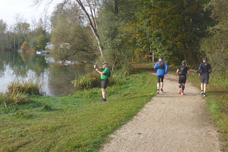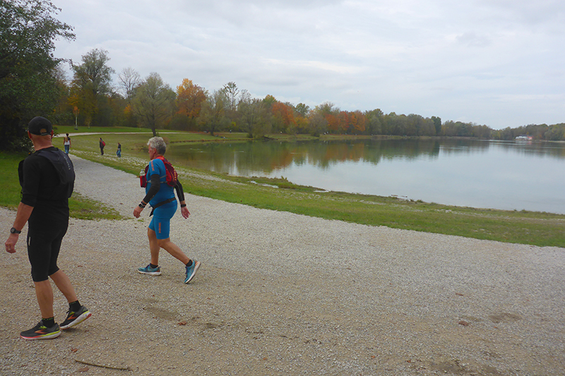 Am Weitmannsee zeigt meine Uhr 300 Meter weniger an als Charly‘s. Welche jetzt genauer geht, können wir natürlich nicht genau sagen, aber ich will auf meinem GPX-Track auch die 42,2 km stehen haben, so muss ich eine etwas längere Schleife als Charly und Roland am Weitmannsee drehen.