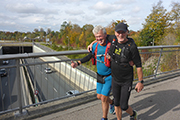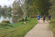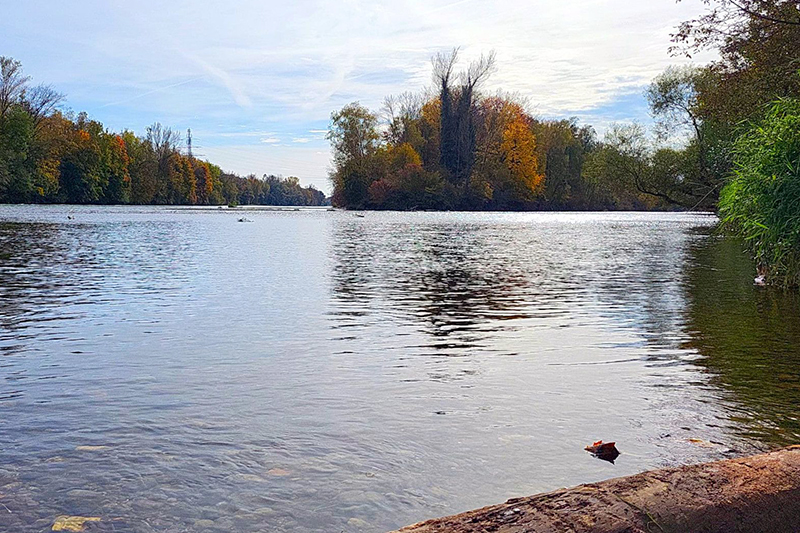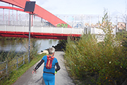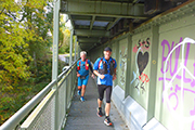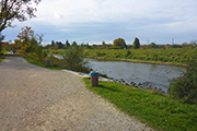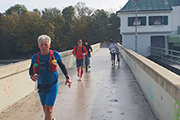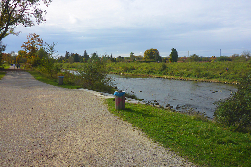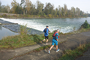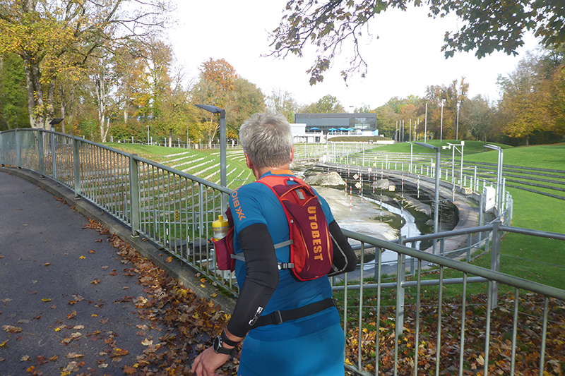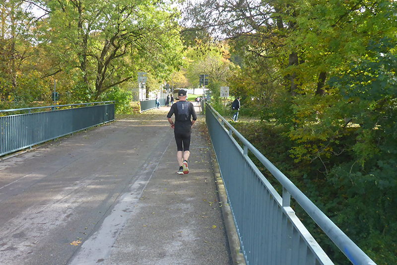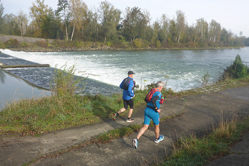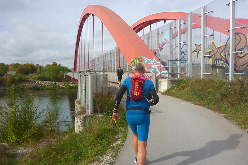 Nach einer Schleife über den Osteingang kommen wir wieder zurück an die rote Autobahnbrücke und setzten auf die gegenüberliegende Seite über, wo wir dann auch etwas später unsere Halbmarathonmarke passieren. Einen Kilometer weiter kommen wir zum Zusammenfluss von Lech und Wertach, die im südöstlichen Oberallgäu nahe der Grenze zu Österreich zwischen Oberjoch und Unterjoch entsteht. Nach 141 km fließt sie kurz vor der A8 in den Lech, der dann nach weiteren 39 Kilometern östlich von Donauwörth in die Donau fließt.