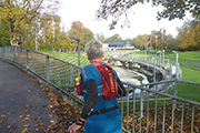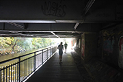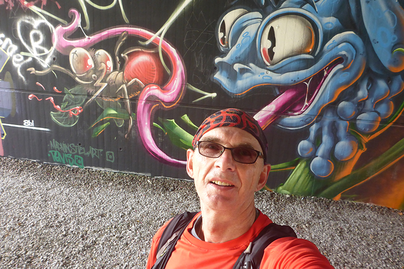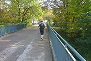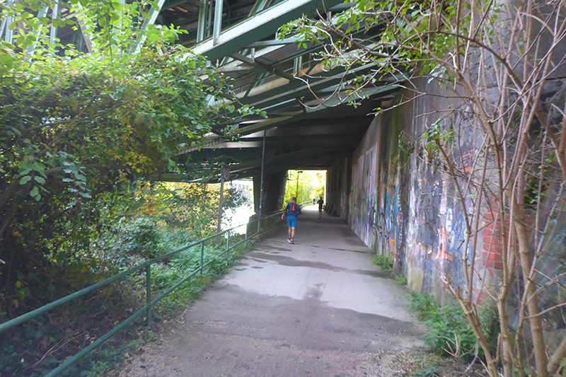 Kurz danach passieren wir die angesagte Kulperhütte, die deutlich besser besucht ist als unsere Haltestelle am Kiosk. Zwischen Wertach und Wertachkanal geht es bis zur B17. Gut vier Kilometer Stadtgebiet liegen jetzt vor uns. Wir wechseln einige Male die Seiten an der B17, die Wege liegen oberhalb der Straße und sind wenig frequentiert und so gut und störungsfrei zu laufen. Etwas aufpassen müssen wir an einer Unterführung zwischen Bahnpark und Messe, hier gibt es keinen Fussweg, so müssen wir auf der Straße laufen. Auf der Straße ist aber so gut, wie nix los.