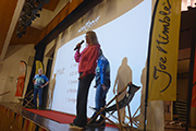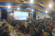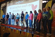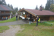 Ein paar Minuten vor Startbeginn bekommen wir noch ein Ständchen von den Alphornbläsern geblasen. Sie haben es auch vorgezogen, im Saal zu bleiben. Mittlerweile ist es fast hell geworden und …es hat tatsächlich aufgehört zu regnen. Schau mer mal, wie lange es hält? Ich habe für alle Fälle einen größeren Rucksack gewählt, mit noch ein paar zusätzlichen Wechselklamotten drin.