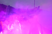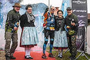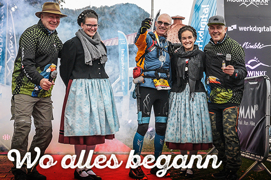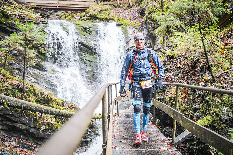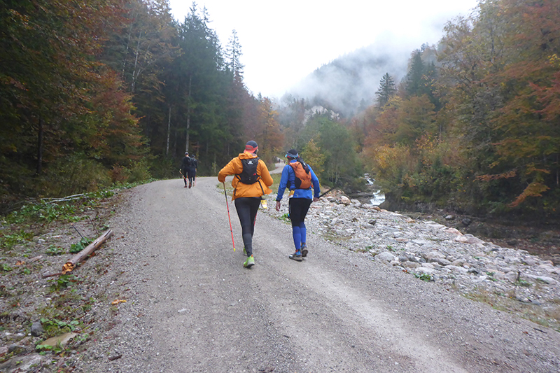 Jutta, Rudi und Stephan und der Bürgermeister von Reit im Winkl geben pünktlich den Start frei. Durch einen mystischen pinkfarbenen Nebel verlassen wir das Startgelände. Zuerst umrunden wir die Sportanlage und bewegen uns anschließend Richtung Waldrand. Die ersten Kilometer sind noch flach und bieten sich wunderbar zum Einlaufen an. Über den Krautloidersteg überqueren wir die Lofer und weiter geht es im Märchenwald an ihr entlang. Jetzt wo es nicht mehr regnet, legen die ersten bereits ihre Regenjacken wieder ab.