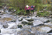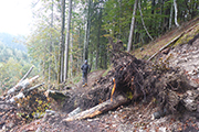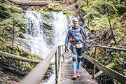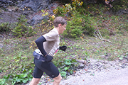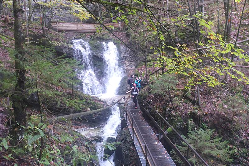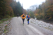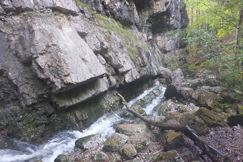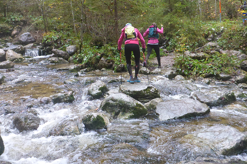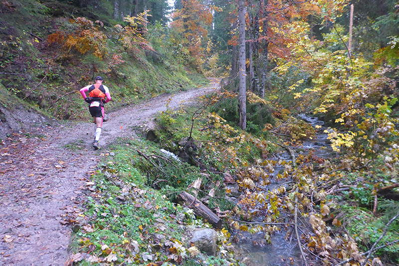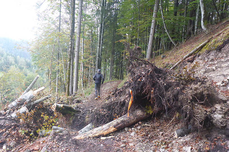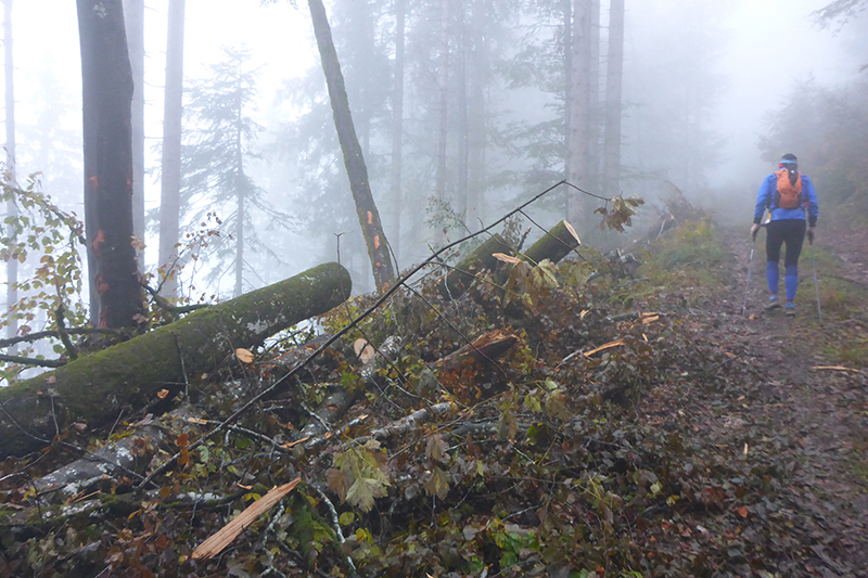 Die nachfolgenden acht Kilometer mussten als Folge des Unwetters neu ins Streckenprofil aufgenommen werden. Sind meist nicht ganz so prickelnd für Trailrunner, aber allemal besser als gar nicht zu laufen. Die kommode Schwarzlofer Forststraße führt uns am gleichnamigen Wildbach entlang aufwärts. Dabei bekommen wir besonders zu Beginn auch einige schöne Einblicke in die wildromantische Schlucht geboten. Flankiert wird unser Aufstieg wieder von jeder Menge gefällter Bäume am Wegesrand.