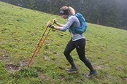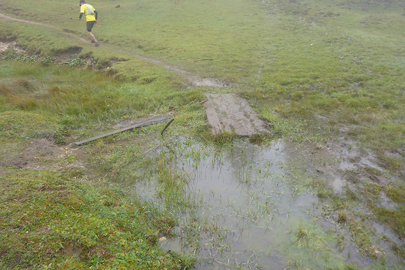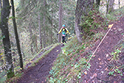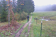 Direkt an der Landesgrenze ziehen wir am Waldrand den Scheibelberg hinauf. Zwischendrin steht ein alter Grenzstein. Nach Ende des Bretterabschnitts wird das Terrain immer schlammiger und feuchter, wir befinden uns jetzt auf einer Skipiste. Dazu fängt es auch an zu nieseln. Nicht schlimm, aber meine Brille ist beschlagen und beeinträchtigt meine Sicht. Als erste Frau der DM überholt mich Juliane Rößler.