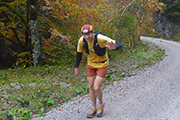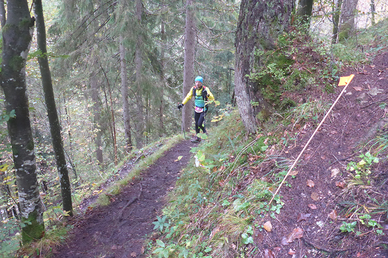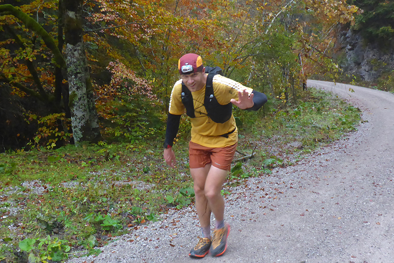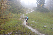 Seit geraumer Zeit warte ich bereits, dass mich die Elite-Läufer der Deutschen Meisterschaft überholen. Dann ist es auch so weit, als Erster passiert mich mit lockeren Schritten Benedikt Hoffmann, aber Manuel Hartweg ist ihm mit einer guten Minute Abstand auf den Fersen. So nach und nach rücken weitere Meisterschaftsläufer auf. Dabei kann ich durchaus unterschiedliche Herangehensweisen beobachten. Während die einen locker und flockig durchpowern, legen andere auch Hiking-Abschnitte ein, um Kräfte, an abschnittsweise steileren Passagen, zu schonen. Viele sind gut gelaunt und freuen sich über meine Anfeuerung, während andere eher konzentrierter bei der Sache sind. Ich versuche immer alle zu fotografieren, aber viele Bilder fallen den schwierigen Lichtverhältnissen zum Opfer. Aber es macht Spaß und bringt Abwechslung die Asse zu beobachten, wenn es schon keine Berge zu sehen gibt.