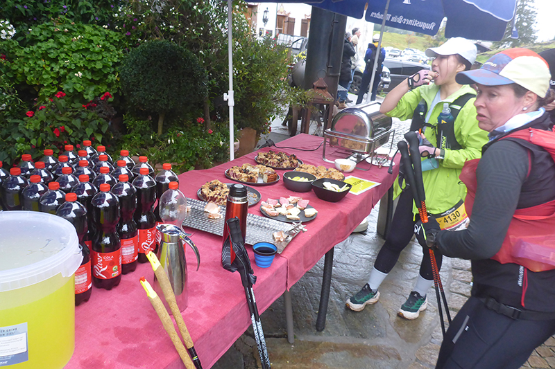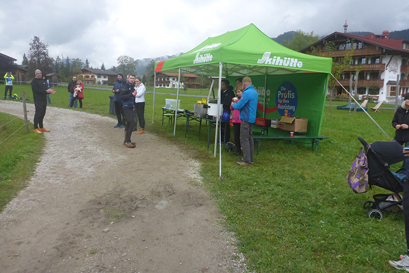 Nach 23 km komme ich endlich in den Genuss einer ersten Labestelle, meine Getränkeflasche ist schon seit einiger Zeit leer. An der Station neben der Sonnenalm wird uns einiges geboten. Mein Frühstück ist etwas mager ausgefallen, habe daher großen Appetit und freue mich auf eine ordentliche Brotzeit. Brote mit Schinken und Käse, Obst und auch Kuchen werden angeboten. Dazu heißer Tee und Cola. Ich benötige ein paar Minuten, um meine verbrauchten Energien wieder aufzufüllen. Ach ja, und noch was …es regnet noch immer nicht. Das hätte ich nicht für möglich gehalten und ist doch ein guter Ansatz für meine zweite Rennhälfte.