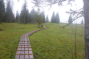 Genau genommen befinden wir uns ja in einem Drei-Länder-Wettkampf, denn wir durchqueren Bayern, Tirol und Salzburg. An der Landesgrenze zum österreichischen Bundesland Salzburg geht es jetzt durch das Natur- und Europaschutzgebiet Winklmoos. Auf einer Länge von 1,5 km ist das Moorgebiet mit ca. einen Meter breiten Brettern ausgelegt und bewahren uns vor nassen Füssen. Vor mir laufen eine Frau und ein Mann mit großen Rucksäcken und Funkgeräten. Sie sind die Schlussläufer der L-Strecke“, erzählen sie mir auf Nachfrage. Deren Teilnehmer*innen sind kilometermäßig noch nicht so weit. Ich hatte schon so eine leichte Befürchtung, liege aber hochgerechnet weit vor dem Zeitlimit von 11 Stunden für die XL-Strecke.