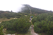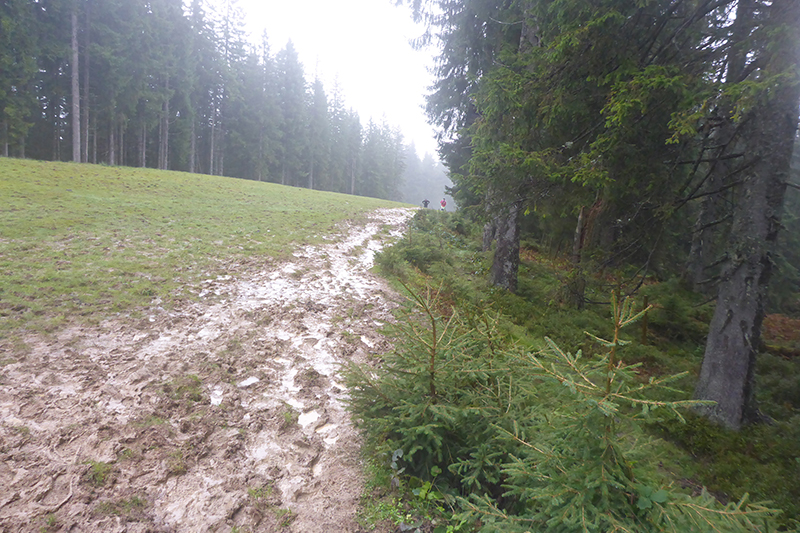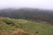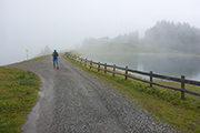 Am Speichersee auf Höhe der Schwarzloferbahn wechseln wir über ins Bundesland Tirol. Hier ist das Wetter wieder trocken und beim anderthalb Kilometer langen Downhill bekommen wir sogar eine ganz passable Aussicht geboten. Man sieht zumindest die Berghänge auf der gegenüberliegenden Talseite. |
