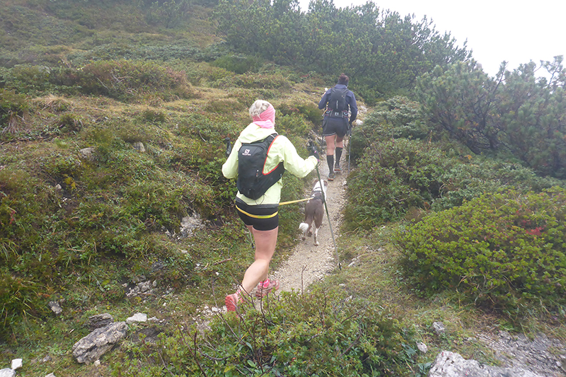 Nach 3 km erreichen wir Gut Steinbach und wenig später den ersten Anstieg. Aber Obacht, hier gibt es eine Streckentrennung. Ein Ordner weist uns darauf hin. Die L-er bleiben im Tal, ihnen werden die ersten 500 Höhenmeter erspart. Ihre Streckenlänge hat sich wegen der Änderungen auf ca. 43 km erhöht. Ein Schotterweg führt uns nach oben. Seitlich können wir viele gefällte Bäume ausmachen, die mussten erst beseitigt werden, um den Weg hier freizumachen, als Folge des Unwetters. Nach gut 9 km haben wir unseren ersten Anstieg hinter uns, es geht abwärts. Fast ausschließlich auf einer gut zu laufenden Forststraße. Von hinten rücken bereits die ersten Hundeführer*innen auf, die eine halbe Stunde nach uns gestartet sind. Die Vierbeiner sind aber auch prächtige Zugmaschinen, wie ich so beobachten kann. Da bleibt wenig Luft für die Mädels zum Verschnaufen.