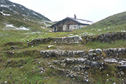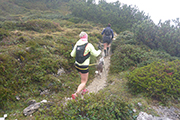 An der Nattersbergalm (km 12) ist eigentlich unsere erste Verpflegungsstation vorgesehen. Eine Mitläuferin, die gerade von der Hütte kommt, meint: hier gibt es nix. Ok, dann weiter. Da muss etwas schiefgelaufen sein. Vielleicht kommt ja später noch eine Station, so wie früher an der Seegatterl Alm, denke ich mir. Nach 14,5 km sind wir unten und erreichen den Parkplatz der Gondelbahn Seegatterl-Winkelmoosalm. Die 8er Gondelbahn kann in einer Stunde 2600 Personen in das Skigebiet befördern. Wir überqueren den weiträumigen Parkplatz, aber auch an der Seegatterl Alm ist tote Hose. Zur Pflichtausrüstung gehört auch das Mitführen von 0,75 Liter Flüssigkeit, so bediene ich mich jetzt an meinem eigenen Vorrat, dafür isser ja da.