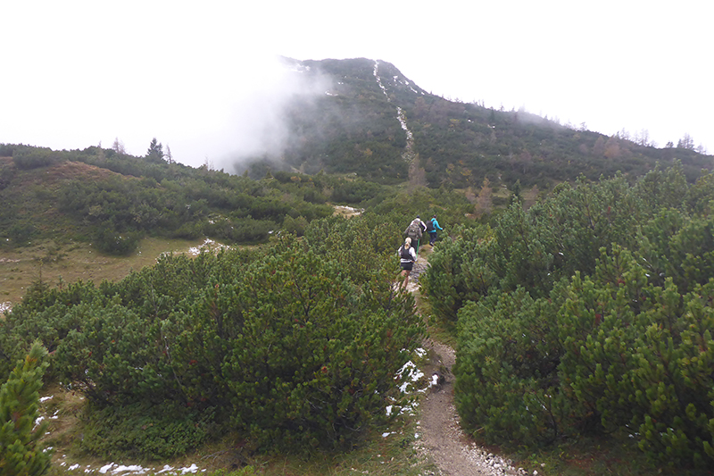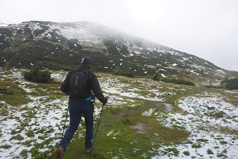 Vor der Bergstation der Scheibelbergbahn ist unser Wiesenaufstieg beendet, es geht nach links weiter ins Skigebiet Steinplatte. Über 500 Meter führt uns eine Abfahrt tiefer ins Skigebiet, bevor wir wieder weiter aufsteigen müssen. Ich benötige dringend eine Pause, ich sehe kaum mehr was.