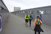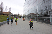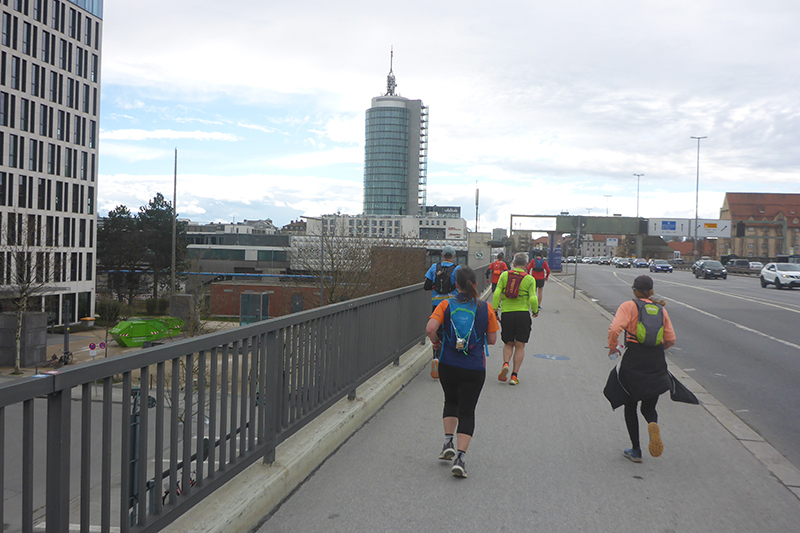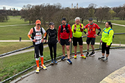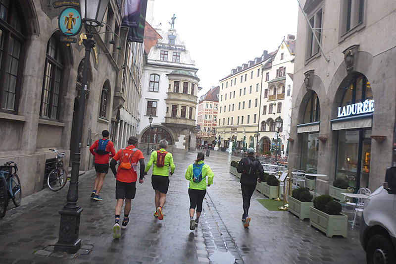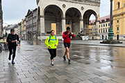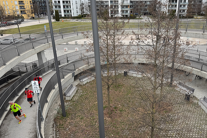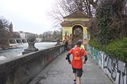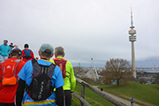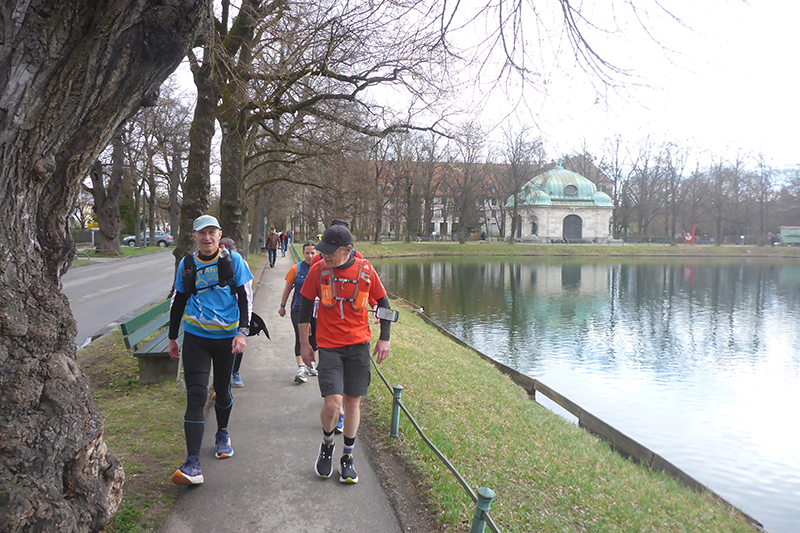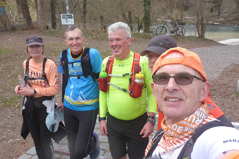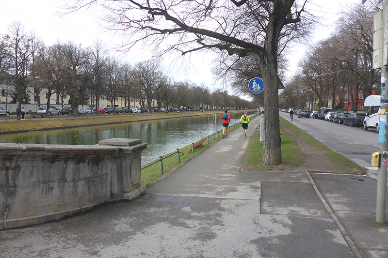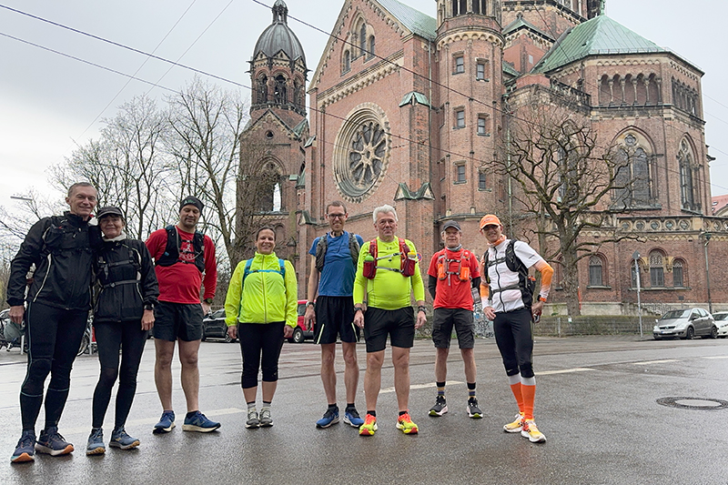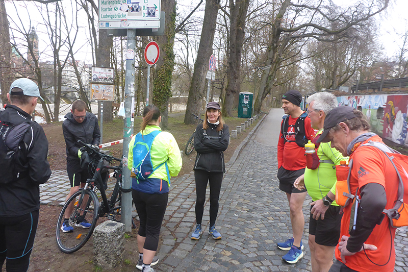 Da die Runde etwas länger als die klassische Marathondistanz ist und auch um eine heikle Ampelquerung einzusparen, starten wir nach 500 Meter Anmarsch auf der gegenüberliegenden Isarseite direkt vor St. Lukas. Alle 8 Teilnehmer sind frühzeitig vor Ort, so können wir sogar 5 Minuten früher, als um die geplanten 9.30 Uhr starten. Nach Absprache mit Andreas ist es auch möglich, an einem anderen Punkt der Strecke zu beginnen. Daniel bevorzugt seinen Start vom Westpark aus und ist so nicht mit uns am Start. Bei einer Auswertung per GPX-Track ist die Kontrolle heutzutage kein Problem mehr.