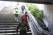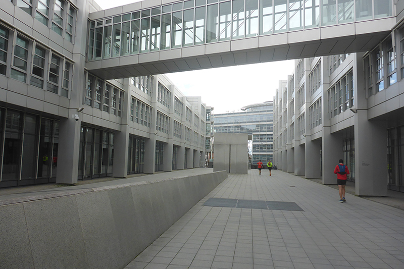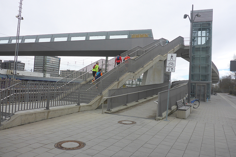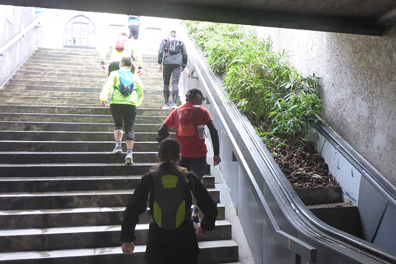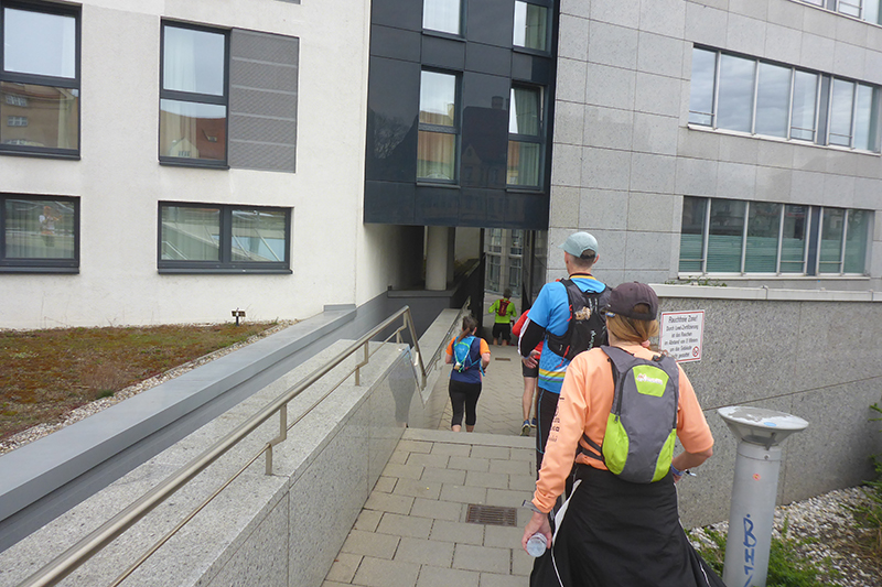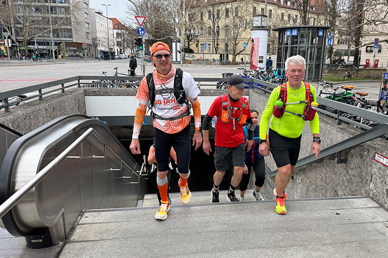 Pünktlich zum Start hat sich auch der Regen verzogen, so können wir trocken unseren Lauf beginnen. In der Maximilianstraße erreichen wir wenig später auch schon unsere erste Unterquerung einer U-Bahn-Station. Da die GPS-Signale hier nicht funktionieren, hat uns Andreas für alle U- und S-Bahn Durchläufe in einer Info-Mail die genauen Ausgänge dokumentiert, die immer mit Buchstaben beschildert sind. Unser erster Durchlauf ist wohl schon seit längerer Zeit in „Grüner Hand“, zumindest was den mit Bambus zugewachsenen Rolltreppenaufgang betrifft.