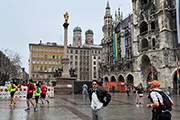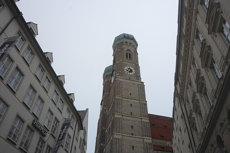 Nach anderthalb Kilometer erreichen wir den Marienplatz. Das trübe Wetter sorgt dafür, dass vor dem Münchner Rathaus noch wenig los ist und wir ungehindert durchlaufen können. Ein paar hundert Meter weiter sind wir auch schon an der Frauenkirche, die wir halb umrunden. Ein Blick nach oben ist hier nicht ganz unwichtig. Bei einem Bürgerentscheid, der inzwischen über 20 Jahre zurückliegt, hatten die Bürger*innen die Möglichkeit, die maximale Höhe von Gebäuden in der Stadt festzulegen. Eine knappe Mehrheit stimmte damals dafür, dass wegen des historischen Stadtbilds kein Haus gebaut werden darf, das höher als die Frauenkirche ist. Der Nordturm der Kirche misst 98,57 Meter, der Südturm ist 98,45 Meter hoch. Seither hält sich der Mythos hartnäckig, dass in der Landeshauptstadt kein neues Gebäude höher sein darf. Eine Vorschrift ist das aber nicht. Ein Bürgerentscheid ist immer nur für ein Jahr bindend. Mehr dazu noch später.