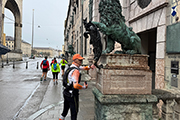 Die Residenzstraße führt uns zum Odeonsplatz und zur Feldherrnhalle. Seit knapp 180 Jahren versprüht sie einen Hauch italienischen Flairs mitten in München. Nun soll das geschichtsträchtige Gebäude, das unter anderem eine zentrale Rolle in der NS-Propaganda spielte, saniert werden. Während der Sanierungsarbeiten wird das Gebäude von Gerüsten und Bauzäunen umstellt sein. Drei Jahre lang werden die Arbeiten dauern. Ergo lasse ich sie nochmal auf mich einwirken. Im Zuge der Arbeiten werden dann auch u.a. sämtliche Natursteinoberflächen instandgesetzt. Und auch die zwei markanten steinernen Löwen an der Eingangstreppe werden gereinigt. Rechts der Feldherrnhalle befindet sich die Residenz mit vier weiteren Löwenfiguren davor. Hier müssen wir kurz abstoppen, um die Schnauzen am unteren Ende des jeweiligen Schilds zu reiben, das bringt angeblich Glück.